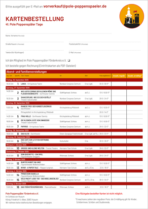 • ob Sie Mitglied im Pole Poppenspäler Förderkreis sind • Name, Anschrift, Telefonnummer • die Spiel-Nummern • die Anzahl der Karten je Spiel getrennt nach Erwachsenen (regulärer Preis) und Kindern, Schülerinnen, Schülern und Studierenden (Ermäßigung)