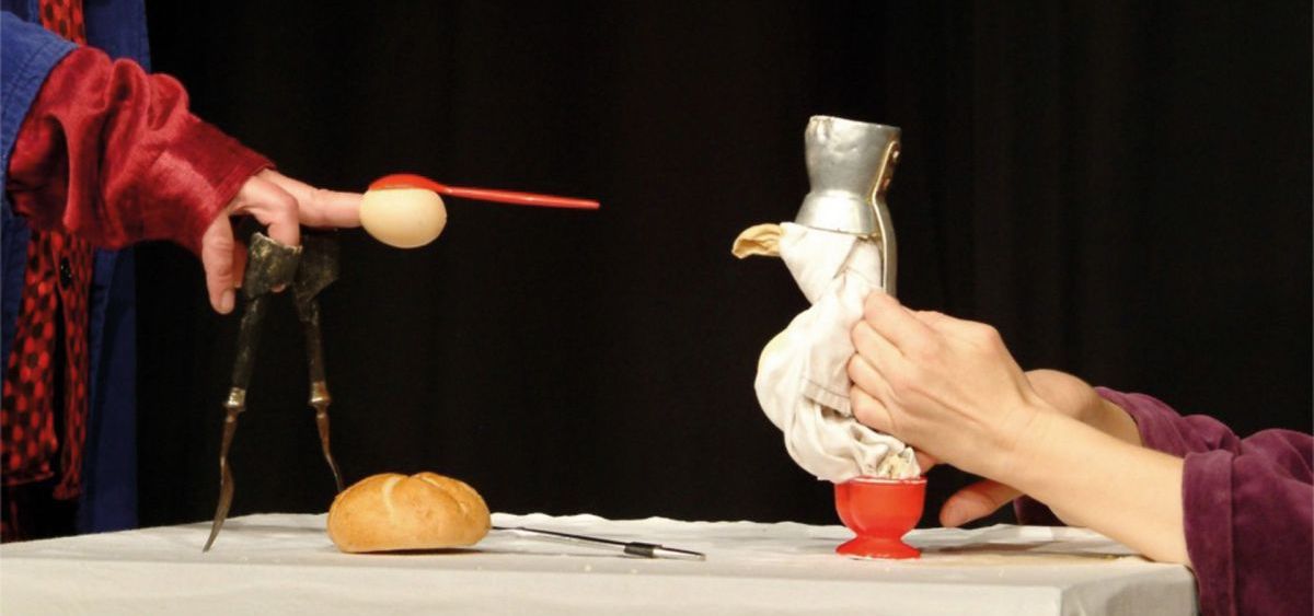 Ein Paar sitzt sich am Frühstückstisch gegenüber. Der Haussegen hängt schief und die Stimmung ist im Keller. Um sich über die Situation zu retten, beginnt einer der beiden dem anderen ein Märchen zu erzählen – bis zu dem Punkt, an dem er die Hilfe des anderen braucht, um die Geschichte weiterzutreiben. Und siehe da, der Partner lässt sich ein und zusammen bringen sie die Geschichte vom verwöhnten König, der auf Brautschau geht, zum guten Ende. 55 Minuten, in denen man sich verblüfft die Augen reiben und hintendrein gar noch eine Träne der Rührung finden kann, ob der minimalistischen und höchst amüsanten Einfälle der beiden Protagonisten. Da geraten Eierbecher zu roten Stiefeln, ein Messer im Brötchen wird zu einem Pferd, der Brotkorb zu einem Boot, die Tischdecke zu stürmischen Wellen. Wie im Grunde jedwedes Material zur Figur geraten kann, das zeigen Sigrun Kilger und Hartmut Liebsch in ihrem kulinarischen Mini-Drama. Viel Vergnügen!