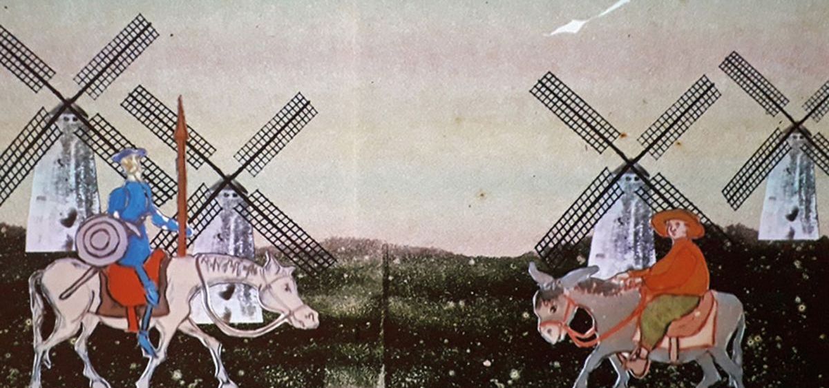 ,Don Quichotte – Ein Spiel’ ist eine Neuinterpretation des Klassikers in Form einer turbulenten One-Man-Show. Da sitzt nun Sancho Panza vor dem Bildschirm, seiner virtuellen Kneipe, und erinnert sich an die gemeinsame Zeit mit Don Quichotte, dem Ritter von der traurigen Gestalt, und an die vielen gemeinsamen Abenteuer. Nur gut, dass alles festgehal ten ist in Bildern, Videos, Texten und Tönen. Natürlich hat Sancho Panza das eine oder andere ,aufgehübscht’. Das macht doch schließlich jeder! Und in der Erinnerung sieht manches ganz anders aus. Wie war es in Wirklichkeit? Ist alles nur erfunden? Das behauptet jedenfalls dieser Miguel Cervantes. Er habe den Roman schließlich geschrieben. „Schreiben kann man viel“, sagt Sancho. „Wie es wirklich war, weiß nur ich, denn ich habe alles miterlebt.“ So erzählt Sancho Panza von den tragikomischen und absurden Abenteuern, die er mit Don Quichotte erlebt hat, als wären sie gerade erst passiert. Flachfiguren und Objekte werden bunt gemixt, zerlegt und wieder zusammengesetzt. Grandios!